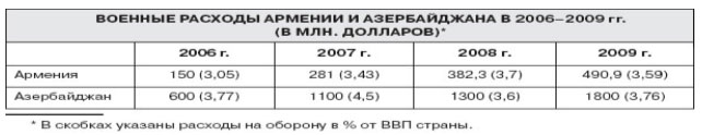 Видно, что начиная с 2006 года, то есть менее чем за три года, расходы на оборону Азербайджана выросли в три раза. В аналогичной пропорции возрос военный бюджет Армении, хотя в абсолютных величинах он гораздо меньше тех средств, что тратит на оборону Азербайджан. Это очень тревожная тенденция. Достаточно вспомнить, что в подобных пропорциях в последние годы развивалась военная машина Грузии. К чему это привело, всем известно. Не повторить бы этих ошибок еще и другим странам.