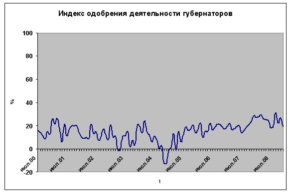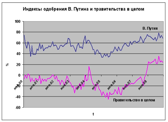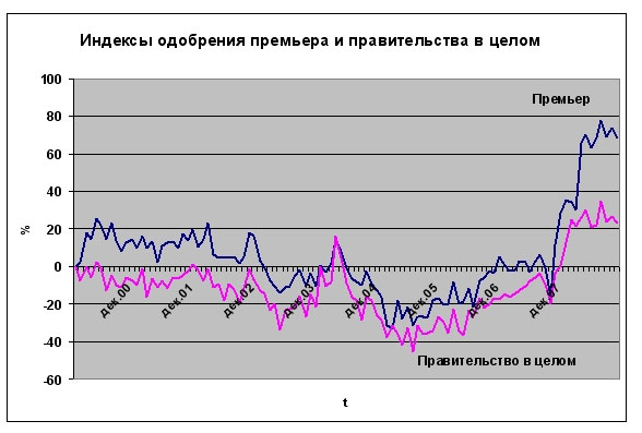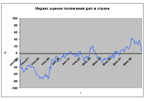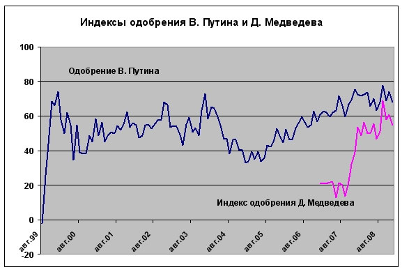 В декабре 2008 года россияне в целом стали хуже оценивать работу президента, премьера и руководителей своего региона. Все больше людей склоняются к тому, что «страна движется по неверному пути»: количество россиян, позитивно и негативно оценивающих «положение дел в стране», в декабре сравнялось. (На всех графиках учтены данные декабрьского опроса.)