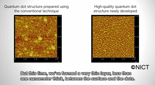 Обычно квантовые точки создаются на поверхности полупроводника и имеют размер, не превышающий 1 миллимикрон (1 нанометр). Японские ученые усовершенствовали технологию - они использовали тонкий разделительный слой (его толщина менее 1 миллимикрона) между поверхностью материала и квантовыми точками, что позволило создать более высококачественные частицы очень высокой плотности.