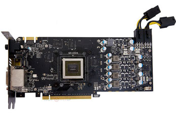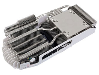 Отличное охлаждение обеспечивается за счет двух 80-мм вентиляторов с 4-контактным разъемом подключения на медном никелированном основании, пяти медных тепловых трубок и 3-секционного радиатора. Карта получает питание от двух 6-контактных разъемов PCI-E (в комплекте поставляются удлинители для упрощенного доступа к разъемам PCI-E Power), на плате имеются восемь чипов памяти GDDR5 (по четыре с каждой стороны) и пять фаз питания — 4+1 (для ядра и ОЗУ).