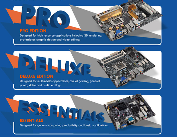 Материнские платы серии ECS Pro созданы специально для мощных компьютеров, серия Deluxe пригодится в небольшом офисе и дома, а Essentials оптимизированы для мультимедийных систем. В новом семействе материнских плат ECS реализована фирменная технология Durathon, обеспечивающая тройную плотность печатных плат, экстремальную защиту от влаги и нагрева. Высококачественные твердотельные конденсаторы с жизненным циклом до 200 тысяч часов призваны существенно улучшить качество материнской платы, гарантировать ее стабильность и долговечность.