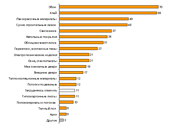 Для последнего ремонта респонденты в основном покупали обои (70%), клей (69%), лакокрасочные материалы (49%) и сухие строительные смеси (48%). Более трети опрошенных приобрели сантехнику (37%) и напольные покрытия (34%). 31% участников опроса указали на керамическую плитку. Герметики и монтажные пены понадобились более чем четверти москвичей (27%). Каждый пятый участник исследования приобрел электротехнические изделия (21%), либо стеклопакеты (21%). Реже всего, по словам респондентов, ими устанавливался теплый пол в доме (5%) и возводились арки (5%).