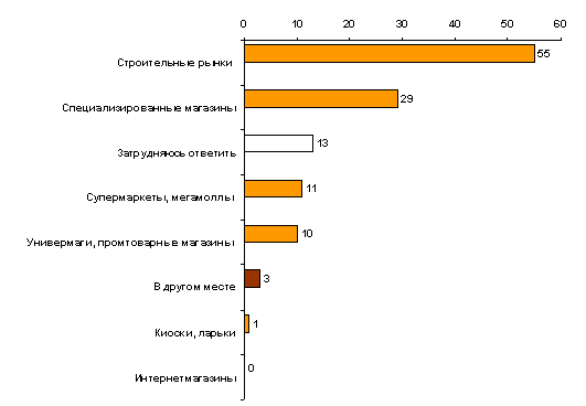 Более половины москвичей, принявших участие в исследовании Ромир, закупали товары для своего последнего ремонта на строительных рынках (55%). Каждый четвертый респондент ответил, что подобные покупки он совершает в специализированных магазинах (29%). Супермаркеты (11%) и универмаги (10%) оказались на третьем месте по популярности. Киоски и ларьки назвал 1% москвичей. Интересно, что ни один из опрошенных не покупал товары в