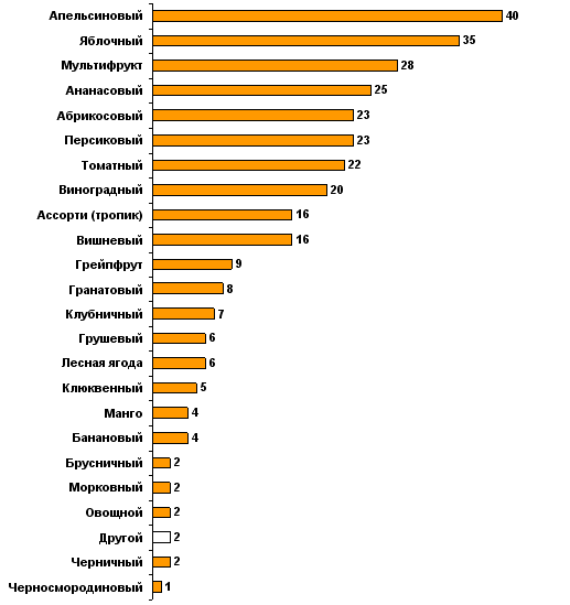 Россияне чаще всего выбирают апельсиновый (40%), яблочный (35%) и мультифруктовый вкусы (28%). При этом апельсиновые соки в основном предпочитают холостяки и незамужние барышни (44%). Руководители предприятий (41%) значимо чаще, чем служащие (27%), рабочие (18%) и пенсионеры (18%) употребляют ананасовые соки. Наименее популярными оказались черносмородиновые соки (1%). Черничный (2%), брусничный, морковный и овощной набрали по 2% голосов от общего числа респондентов.