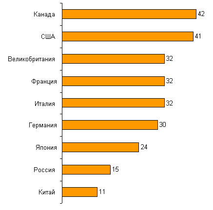 42% участников исследования пожелали жить в Канаде, причем чаще это были мужчины (46%), респонденты не старше тридцати лет (46%), опрошенные с высшим образованием (52%), граждане с высоким доходом (54%). На втором месте — США (41%). Франция (32%), Великобритания (32%) и Италия (32%) замыкают тройку наиболее привлекательных для проживания государств. 30% опрошенных предпочли бы жить в Германии.