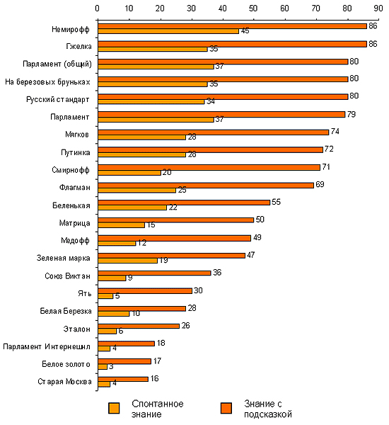 В категории «знание с подсказкой» чаще других водочных марок выбирались Nemiroff (86%) и «Гжелка» (86%). Данные опроса отчётливо продемонстрировали сложившуюся среди россиян лояльность к продукции Украинской водочной компании Nemiroff. Именно эта марка приходит в голову большинству россиян при слове «водка».