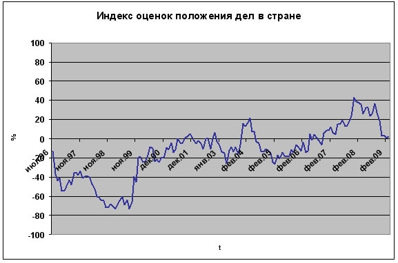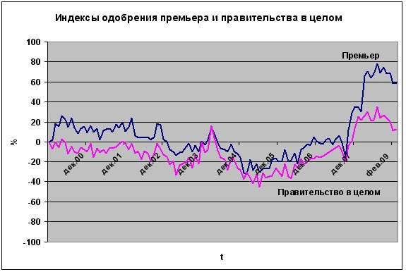 В марте 2009 годам рейтинги одобрения деятельности президента, премьера, правительства в целом и губернаторов, оценки положения дел в стране стабилизировались. Зафиксированные изменения не превышают уровня статистической погрешности.