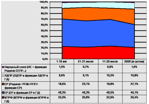 Как видно, в сравнении с 2006 годом произошло довольно значительное перераспределение информационных потоков от второй партии власти («Справедливой России») к первой («Единой России»). Если в 2006 году «ЕР» цитировалась и упоминалась в 40,1% публикаций всех СМИ (ТВ. радио, газеты, Интернет, как центрального так и регионального уровней), то в первой декаде августа 2007 года этот показатель составил 48,3. Доля партий, образовавших «Справедливую Россию», в