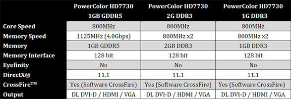 Модели из нового семейства различаются конфигурациями, в частности, памятью. Карты серии HD7730 оснащены 1 Гб памяти DDR5, 1 Гб или 2 Гб - DDR3. Последние работают на частоте 800 МГц х2, и 1125 МГц присутствует в варианте с памятью DDR5. Кроме того, все три модели оснащены 384-потоковыми процессорами, обеспечивая отличную производительность для широкого спектра применения.