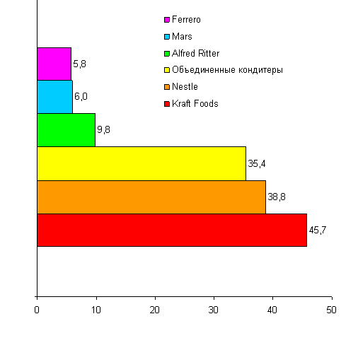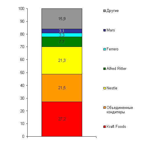 Рынок шоколадных плиток достаточно концентрирован. Доля шести компаний в денежном выражении достигает 85%. Лидером является «Kraft Foods» c долей 27,2%. На втором месте — отечественная компания «Объединенные кондитеры» (21,5%). Замыкает тройку «Nestle» (21,3%).