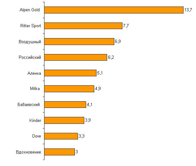 В десятке лидеров среди шоколадных брендов представлена продукция каждого из указанных выше производителей. Наибольшую долю в денежном выражении занимает основная марка «Kraft Foods» — Alpen Gold (13,7%). На втором месте Ritter Sport (7,7%) — бренд немецкого производителя «Alfred Ritter». 6,9% — доля в денежном выражении другого продукта «Kraft Foods» — шоколада Воздушный.