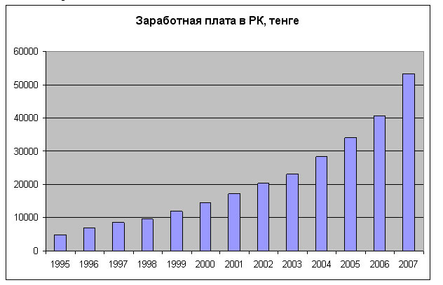 Так как у нас большинство населения — это наемные работники, то их доход равняется заработной плате. На конец 2007 года средняя зарплата в стране равнялась 53 238 тенге, то есть примерно 440-450 долларов, причем с каждым годом она растет.